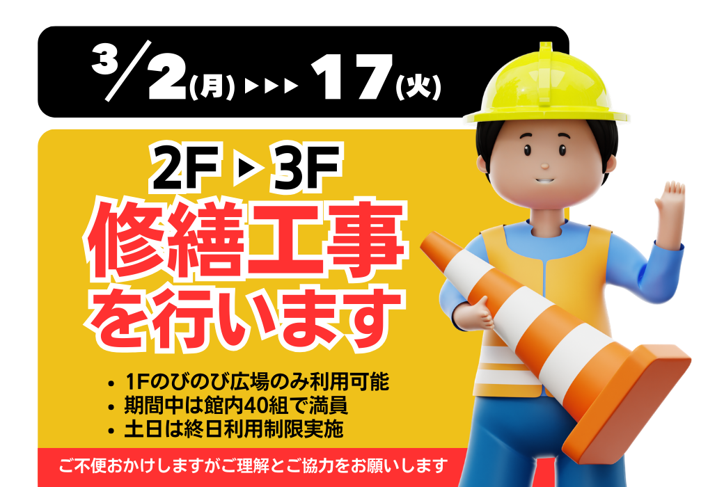 工事期間中は、2F・3Fはご利用いただけません。