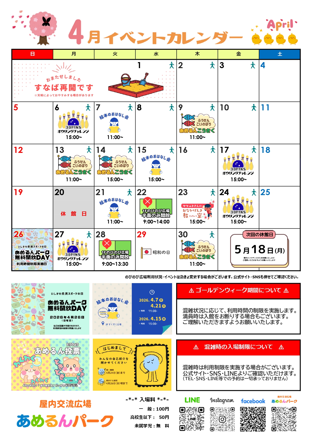 こんにちは、4月!やわらかな春の日差しに包まれ、新しい季節のはじまりを感じる頃となりました🌸色とりどりの花や、心地よい風に、春の訪れを感じますね。あめるんパークでは、新しい季節のスタートにあわせて、春を楽しめるイベントをご用意しています✨新しい出会いやはじまりの季節に、思い出に残る楽しいひとときをお過ごしください。