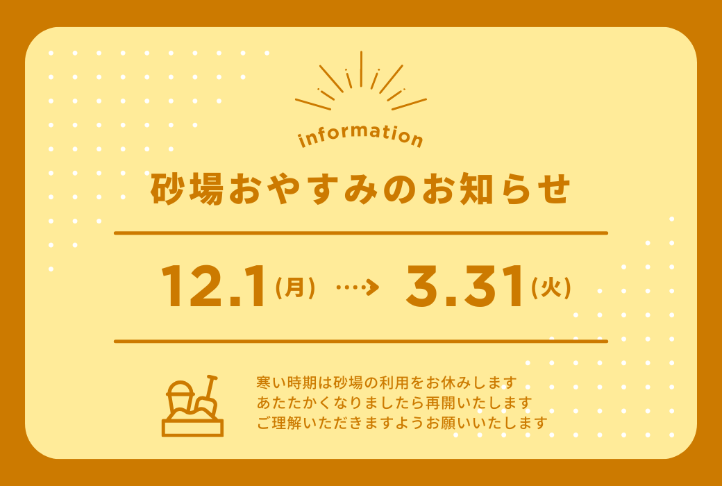 いつもご利用いただきありがとうございます。砂場エリアは、気温が低い時期の安全確保のため、冬季のあいだ利用を休止しております。あたたかくなる頃に再開を予定しております。ご不便をおかけしますが、ご理解のほどよろしくお願いいたします。【休止期間】令和7年12月1日~令和8年3月31日