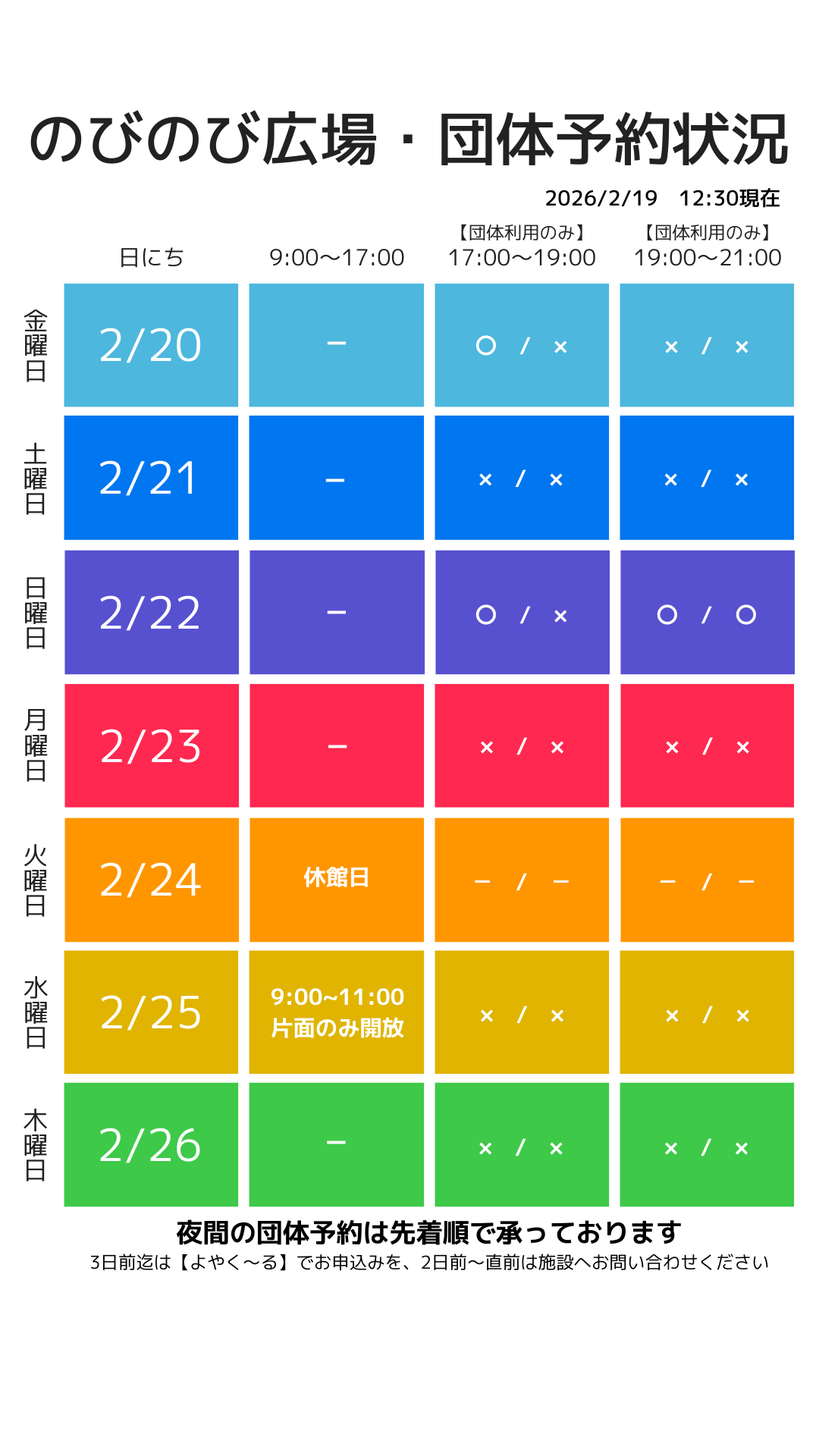 17:00~・19:00~は団体利用が可能です。3日前まではよやく~るよりお申込みを、2日前以降は施設へ直接お問い合わせください。ご予約は先着順となります。フットサルやラグビー、ダンスレッスンなどのサークル活動にぜひご活用ください。