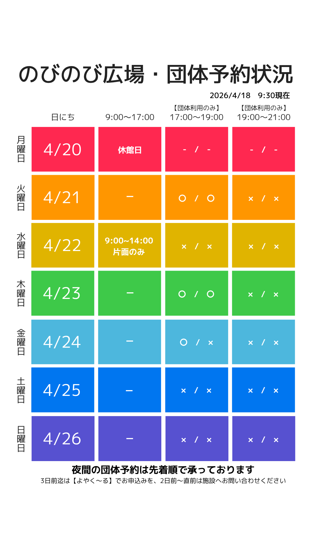 17:00~・19:00~は団体利用が可能です。3日前まではよやく~るよりお申込みを、2日前以降は施設へ直接お問い合わせください。ご予約は先着順となります。フットサルやラグビー、ダンスレッスンなどのサークル活動にぜひご活用ください。https://yoyacool.e-harp.jp/ishikawa