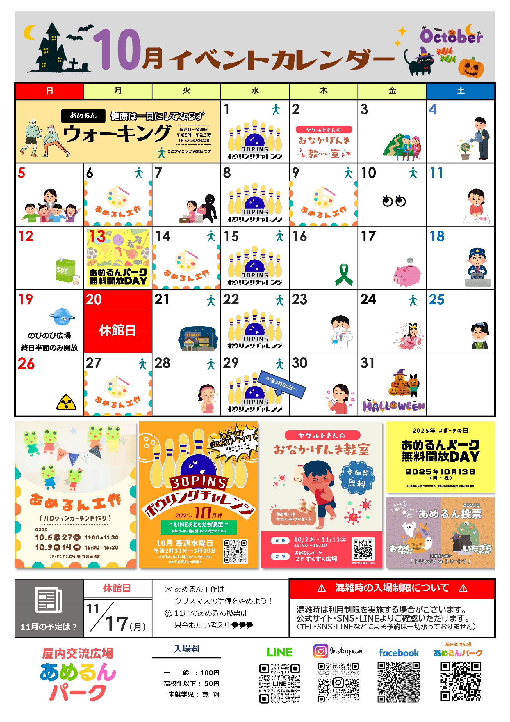 🎃 いよいよ10月!秋も深まってきました 🍂空気が澄み、紅葉が少しずつ色づく季節夜には星空がひときわきれいに輝きます✨あめるんパークではハロウィン気分も楽しめる秋イベントをたくさんご用意しています家族やお友だちと一緒に、思い出に残る“実りの秋”を過ごしましょう🍁🎶