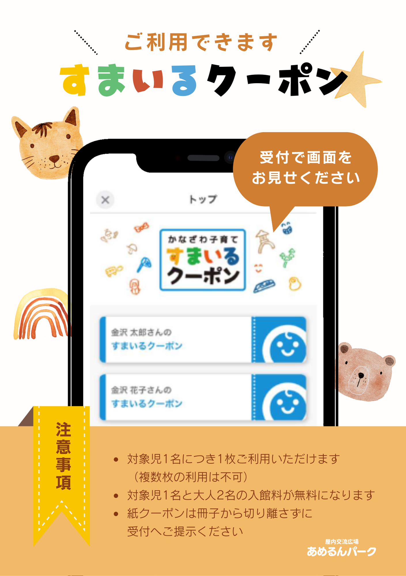 あめるんパーク、金沢プールではすまいるクーポンが利用できます✨・対象児1名につき1枚ご利用いただけます (複数枚の利用は不可)・対象児1名と大人2名の入館料が無料になります・紙クーポンは冊子から切り離さずに受付へご提示ください