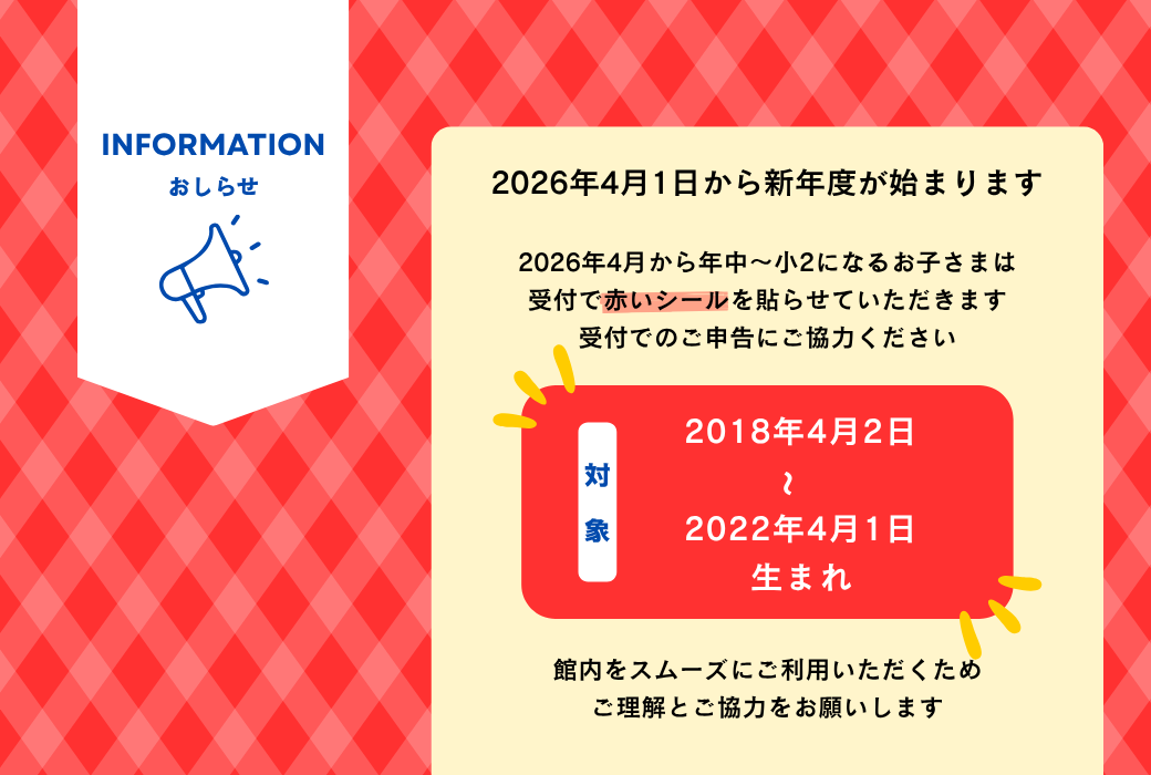 2026年4月1日から新年度が始まります。2026年4月1日から年中~小2になるお子さまには受付で赤いシールを貼らせていただきます。受付でのご申告にご協力ください。⦿対象年齢2018年4月2日~2022年4月1日生まれ⦿シール対象期間2026年4月1日~2027年3月31日館内をスムーズにご利用いただくため、ご理解とご協力をお願いします。